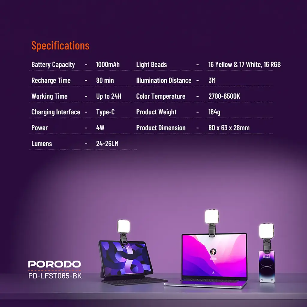 پورودو لایف استایل کلایپ-آن فیل لایت یک منبع نور حرفهای و قابل حمل است که به صورت کلیپآون یا با استفاده از پایه آهنربایی بر روی دستگاههای مختلف نصب میشود. این نور مجهز به LEDهای با کیفیت بالا است که نور یکنواخت و بدون سایه را ارائه میدهند. کاربر میتواند بین سه سطح روشنایی (Low, Medium, High) و سه دمای رنگ (Cool, Neutral, Warm) سوئیچ کند تا نور مناسب برای هر شرایط نوری را تنظیم نماید. باتری داخلی آن تا ۲ ساعت کار مداوم با حداکثر روشنایی دوام میآورد و از طریق پورت USB-C شارژ میشود. طراحی جمعوجور و وزن سبک آن باعث میشود به راحتی در جیب یا کیف قرار گیرد.