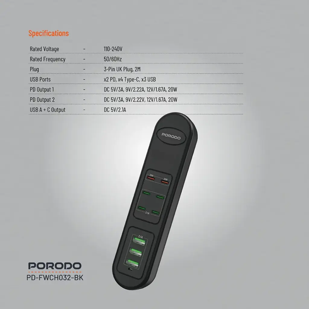 شارژر رومیزی پرودو مدل (FWCH032) Multi-Port با توان 50 وات یک دستگاه قدرتمند و چندمنظوره برای شارژ همزمان چندین دستگاه الکترونیکی است. این محصول با طراحی مدرن و کیفیت ساخت بالا عرضه شده و برای کسانی ساخته شده که به دنبال یک شارژر رومیزی جمعوجور، سریع و ایمن هستند.