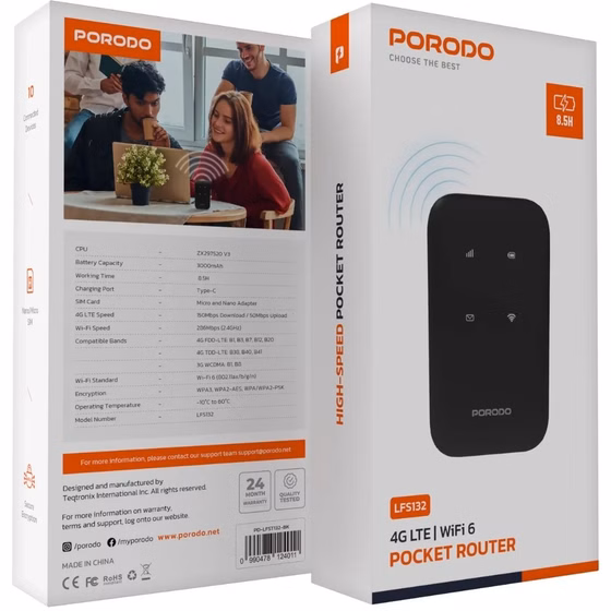 مودم جیبی Porodo PD-LFST132 یکی از محصولات پیشرفته برند پرودو است که برای کاربرانی طراحی شده که نیاز به اینترنت پرسرعت و پایدار در هر شرایطی دارند. این مودم با پشتیبانی از شبکه 4G LTE، سرعت دانلود و آپلود بالایی را فراهم میکند و با فناوری WiFi 6 امکان اتصال چندین دستگاه بهطور همزمان با سرعت و پایداری بیشتر را میدهد.