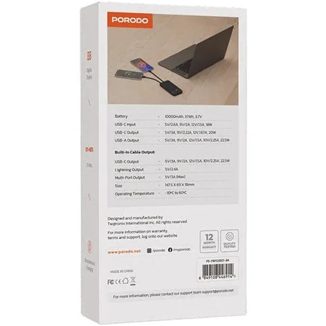 این پاوربانک از برند معتبر Porodo با ظرفیت ۱۰,۰۰۰ میلیآمپر، مناسب برای شارژ چندباره گوشیهای هوشمند، هدفونهای بیسیم، ساعتهای هوشمند و سایر دستگاههای USB است. طراحی آن بهصورت تخت و سبک بوده و بهراحتی در کیف یا جیب جا میگیرد. مجهز به دو پورت خروجی USB-A و یک پورت USB-C با قابلیت شارژ سریع، این مدل امکان شارژ همزمان چند دستگاه را فراهم میکند. همچنین دارای نشانگر LED برای نمایش میزان شارژ باقیمانده است. بدنهی مقاوم در برابر خطوخش و نوسانات برق، ایمنی دستگاههای متصل را تضمین میکند. این پاوربانک برای استفاده در سفر، محل کار یا دانشگاه بسیار کاربردی است.