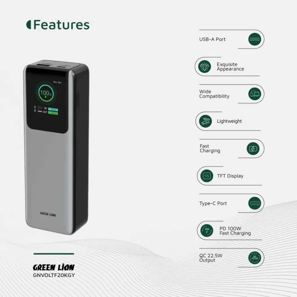 پاوربانک Voltura از برند Green Lion با ظرفیت بالا و توان ۱۰۰ وات، مناسب برای کاربرانی است که به شارژ سریع و مطمئن نیاز دارند. این دستگاه با پورت‌های متنوع از جمله USB-A و USB-C، امکان شارژ هم‌زمان چند دستگاه را فراهم می‌کند. توان ۱۰۰ وات آن به‌ویژه برای شارژ لپ‌تاپ‌ها، مک‌بوک، آیپد پرو و سایر دستگاه‌های پرمصرف بسیار کاربردی است. بدنه‌ی مقاوم و طراحی مینیمال آن، حمل‌ونقل را آسان کرده و برای استفاده در سفر، محل کار یا دانشگاه کاملاً مناسب است. نشانگر LED میزان شارژ باقی‌مانده را نمایش می‌دهد و فناوری محافظت در برابر نوسانات برق، ایمنی دستگاه‌های متصل را تضمین می‌کند.