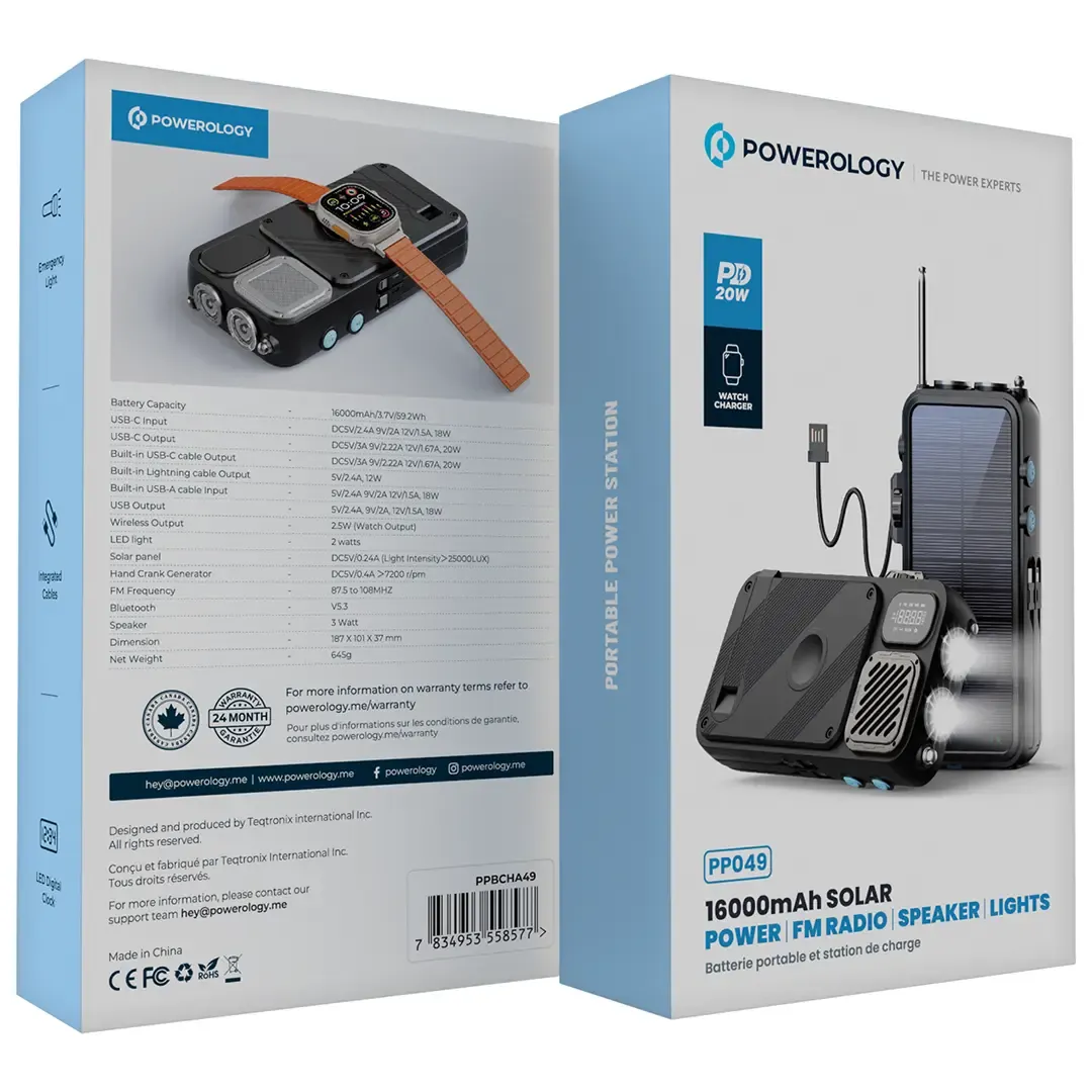 پاوربانک خورشیدی پاورلوژی مدل PP049 ظرفیت 16000 میلیآمپر یک پاوربانک چندکاره و حرفهای است که برای سفر، کمپینگ و شرایط اضطراری طراحی شده. این محصول علاوه بر شارژ معمولی، قابلیت شارژ خورشیدی و حتی شارژ دستی با هندل مکانیکی دارد.