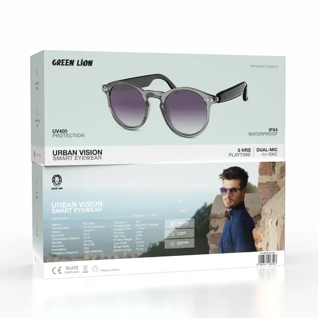 عینک Urban Vision با لنزهای تخصصی آنتی بلو (ضد نور آبی) و محافظ UV400 طراحی شده که تا ۹۹٪ از اشعه‌های مضر خورشید و نور آبی ساطع شده از صفحات دیجیتال (مانند گوشی، لپ‌تاپ و تلویزیون) را فیلتر می‌کند. این عینک مجهز به بلندگوهای نامحسوس استریو در دسته‌ها است که امکان پخش موسیقی و تماس‌های تلفنی را بدون نیاز به هندزفری فراهم می‌کند. میکروفون با قابلیت حذف نویز محیطی، کیفیت صدای شفاف در مکالمات را garant می‌کند. کنترل لمسی روی دسته‌ی عینک امکان تنظیم صدا، پاسخ به تماس و فعال کردن دستیار صوتی (مانند Siri یا Google Assistant) را میسر می‌سازد. بدنه‌ی سبک و قاب انعطاف‌پذیر آن برای استفاده‌ی طولانی مدت مناسب است.